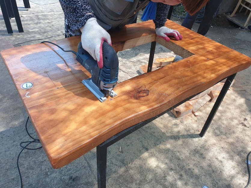 중고 통나무 상판에 손님이 원하시는 로스타 사이즈에 맞게끔 타공 작업을 하는 중 입니다
