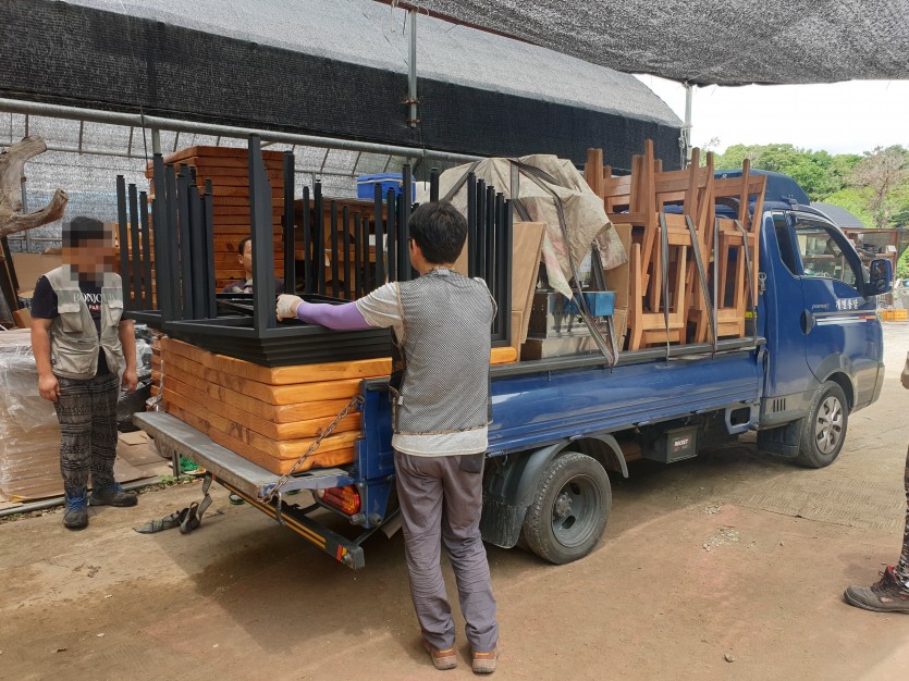 중고 목재의자30개,통나무 테이블 12개,사각 로스타 12개 납품 준비 중입니다~